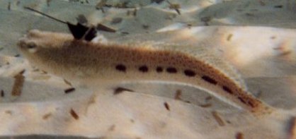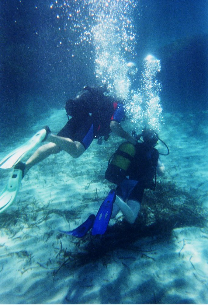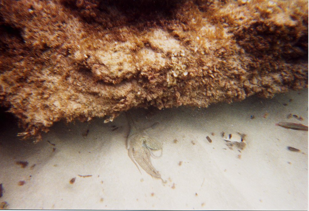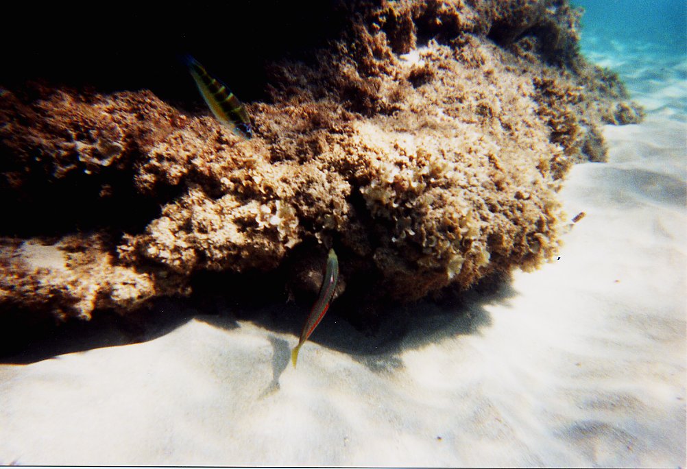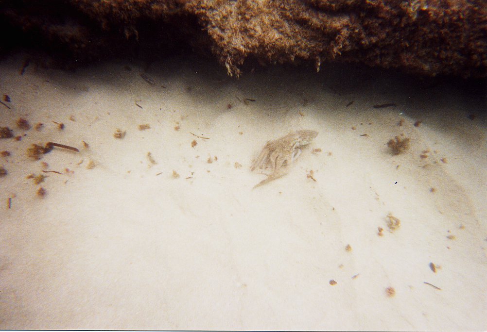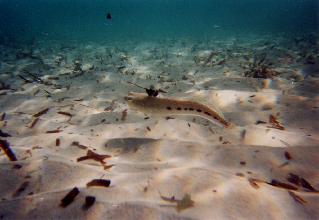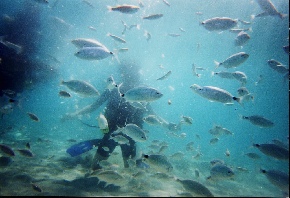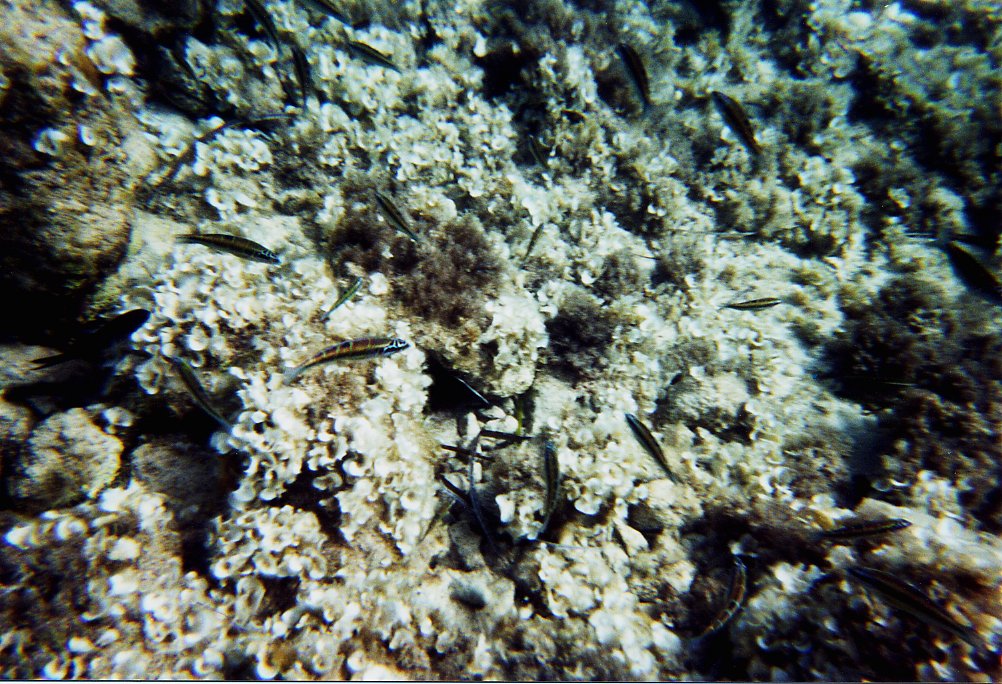 Tauchfotos vom Sommer 2001 Cala Tarida, Ibiza in direkter Strandnähe Direkt in Strandnähe gibt es dort sehr viele Fische, die man schon beim Schnorcheln gut beobachten kann: Meerpfauen, Meerjunker, Schriftbarsche, Tintenfische, Goldstriemen, Petermänchen, eine Art Flöten oder Trompetenfisch (Schwärme), Mönchsfische, Zweibindenbrassen. Sogar einen Zwergdrachenkopf haben wir dort (beim Schnorcheln) gesehen.